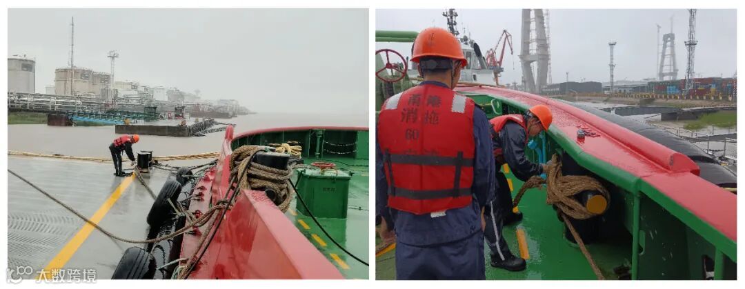 在风急浪高、雨幕如织的码头前沿,轮司船员们直面风雨,争分夺秒加固水上防线。他们冒雨为锚机、舵机等船舶关键设备加强防水防护,严防内涝,仔细排查码头每一处防护桩,奋力系紧每一条缆绳,力求将台风可能造成的破坏降至最低。