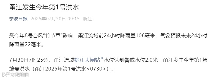 台风“竹节草”不仅带来强风,更携裹着持续强降雨。30日7时25分,甬江流域姚江大闸站水位达到警戒水位2.0米,甬江发生今年第1场编号洪水。