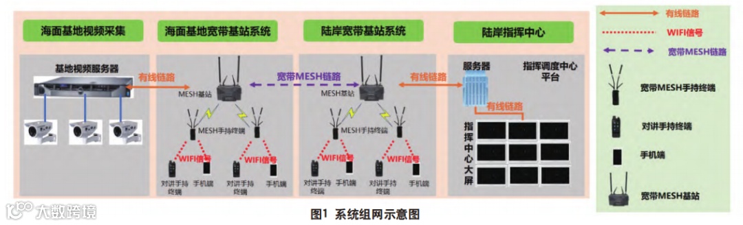 海上养殖平台海上及海下各区域多路摄像头,通过有线链路汇聚到海面基地总控室,总控室通过有线链接方式将视频数据传输给海基大功率自组网基站,并通过宽带Mesh极跳方式回传给陆地岸基大功率基站,经由运营商链路将相关视频数据传输给指挥中心调度平台并做图形化呈现。示意图如图1所示。