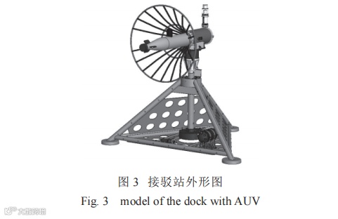 根据接驳形式的不同,接驳站可分为捕捉式、包容式、平台式3种。其中包容式的接驳方式对AUV改造较小,并且在接驳时对 AUV 有保护作用,适用于海底观测网系统,本文介绍的接驳站属于包容式,如图 3所示。接驳站结构上可划分为以下几块。