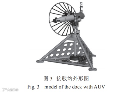 接驳站上部为漏斗形的导引段及对接筒。导引段起到引导 AUV 顺利进入既定接驳位置的作用。整个导引段最大外径2000 mm,由2根不锈钢圆环与 18 根玻璃钢圆杆构成。而对接筒则为AUV 提供安全停靠、补给能量和传输数据的空间位置,是 AUV 最后停留的基站。对接筒体呈中空圆柱形,内壁直径为380mm( AUV 直径 350 mm),壁厚为20 mm。对接筒在水平位置两侧开有引导槽,底部留有插拔缺口。此外,在对接筒侧边装有到位传感器,用于AUV进坞的检测。