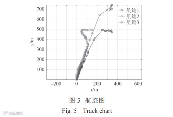本次海试接驳站总计布放时间达到5个月,并在期间进行了数十次 AUV接驳试验。试验时通过水声通信,可捕捉 AUV 在航行中的坐标点,得出 AUV 向接驳站靠近过程中的航迹,如图 5 所示。AUV 在较远处通过计算相对方位调整自身航向,直至与基线重合,随后沿基线进入接驳站。最终,经过试验验证,该接驳系统单次对接成功率达 90% 以上。