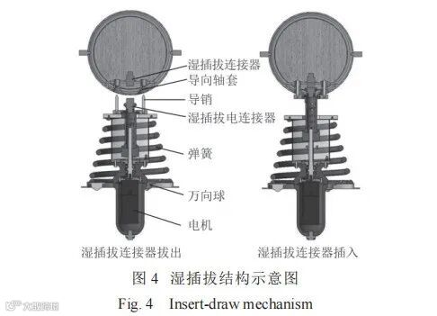湿插拔模块用于实现水下电连接器的导引、对正和插拔功能,结构如图4所示。它通过梯形螺母在丝杆上的运动实现上下插拔,并将插销机构安装在底部配有万向节的锥形弹簧上,便于实现轴向偏移及偏角,保证机构的轴向位置及角度纠偏能力(±20 mm,±15°)。