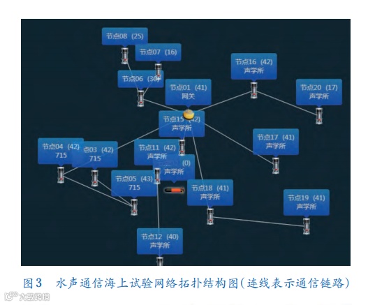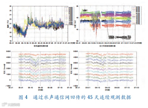 在水声通信网技术方面,国内很多单位都开展了跟踪研究,在网络协议设计、仿真分析方面做得比较多,受经费支持限制,海试研究一直比较薄弱。“十一五”计划期间的“863”重点项目“水声通信网络节点及组网关键技术”是我国当时支持力度最大的水声通信网项目,由声学所、哈尔滨工程大学、715 所、浙江大学等单位联合承担。该项目开展了面向不同应用的水声通信网络协议仿真研究,并主要针对海洋调查应用制定完成了一套水声通信网络协议规范,利用项目组研制的半物理仿真平台完成了实验室测试后,在海南近海开展了持续45天的海上试验(图3),实现了对海区水温、压力和流场的连续实时观测(图4),验证了水声通信节点、网络协议的功能和性能,展示了水声通信网在组网观测方面的能力。