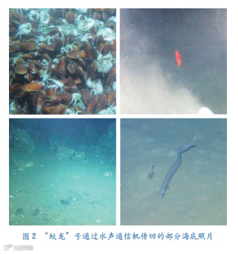 在“蛟龙”号海试与 2013年以来的试验性应用中,“蛟龙”号成功下潜了150多次,水声通信系统实现了母船对潜水器的实时监控,保障了母船与潜水器之间顺畅的通信联系,传回了大量现场照片(图2),为“蛟龙”号的成功下潜发挥了关键作用。