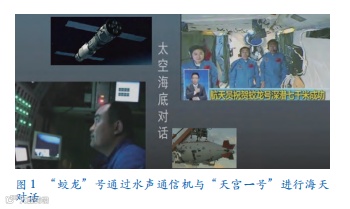 在上述工作的基础上,2002年在国家“十五计划期间的“863”重大专项“7000米载人潜水器”中声学系统的论证过程中,声学所提出了采用相干通信技术高速传输图像的和采用非相干通信技术实现中速传输传感器等数据的中程高速数字化水声通信技术方案,实现在 8-10km 距离内以最高10 kbits/s的速率传输数据、语音和图像,目标是在研制完成时仍具有国际先进水平。在研制过程中完善和发展了空间分集-多普勒频移补偿-自最佳自适应判决反馈均衡器技术,研究并应用了 Turbo-TCM 码编解码技术、基于小波变换的抗误码图像传输技术、低码率的语音编解码技术等。在经过2009年“蛟龙”号载人潜水器第一次海试后,声学所对海试中暴露出来的问题进行了改进,重点是克服了母船噪声的干扰,提高了设备的可靠性和操作便利性;在后续的海试中水声通信效果良好,母船和潜水器之间信息交流顺畅,语音清晰传回了大量数据和水下作业照片,综合性能优于同类国际载人潜水器水声通信系统。2012年6月24日,“蛟龙”号在7000米深的海底通过水声通信系统与在太空的“天宫一号”航天员实现了海天对话,这在国际上也是一次创举(图1)。