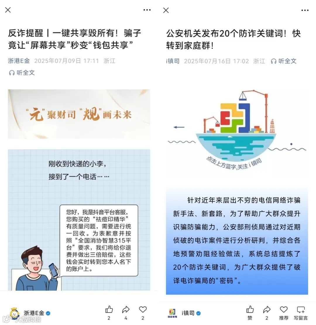 充分利用集团“浙江海港”微信公众号和各基层单位微信公众号、微信群、钉钉群等线上载体,持续推送反诈知识、预警提示、典型案例解析、宣传海报及短视频,进一步提升宣教频次。