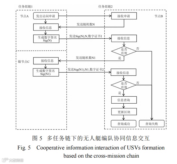 为防止信息在交互过程中被恶意篡改或因个体节点受损导致数据丢失的问题,在联盟链网络中,采用非对称加密技术与加密哈希函数所组成的数字签名技术以保证原始信息的可靠性和准确性。多任务链下的无人艇编队协同信息交互流程如图 5所示。节点 A 跨任务链访问节点 B 内的关键信息,需先完成节点认证,流程如下: