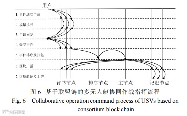 无人艇编队通过部署在岸基的中心站或卫星通信、短波及超短波通信等手段实现协同指挥与决策。基于作战规则的情报信息通常是格式化报文或标准化协议的电子数据,借助于区块链技术,可选择不同的合约库和共识算法,以实现对指令下发、决策部署、行动跟踪、数据追溯等不同场景下的具体应用。以下发指令事件为例,在联盟链网络中,由用户(或是联盟某成员节点)向某任务组链发起指令下达事件,该事件的执行需由任务组链中所有节点共同参与完成,其流程如图 6 所示。