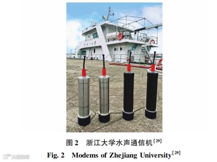浙江大学团队基于水声通信中直接序列扩频的方法,利用原始扩频波形的周期性相关特性叠加多个序列,在发射器的每个模块内同时调制多个不同的符号[23]。针对高速率水声通信信道估计难题,提出了期望最大化改进稀疏贝叶斯学习算法的信道估计理论,实现了高速率相干水声通信[24]。该团队还提出了一种实验后现场数据复用方法,用于测试多址水声通信的单载波调制( singlecarrier modulation, SCM) 和 OFDM 信号[25]。应对水声通信收发相对运动下的信道估计难题,提出了多径-多普勒双一维压缩感知信道估计理论,提升了对恶劣信道估计准确度[26]。应对远距离水声通信网络长传播时延的难题,提出了一种利用传播时间差的并发传输 MAC 理论,降低了远距离水声通信网络的端到端时延,提升了吞吐量[27]。针对水下设备的能量限制和对数据收集的巨大需求,介绍了一种自主水下航行器( autonomous underwater vehicle,AUV)辅助的水声传感器网络[28]。该团队利用高能效、低噪声电路设计方法最终设计出 UACM-M200 和 UACM-M1500 这 2 种型号的小型化、低功耗水声通信机来应对不同的海深作业条件。如图 2 所示,该通信机的最大有效通信速率为 3. 07 kbit / s,在舟山附近海试传输距离为4. 5 km,在云南抚仙湖实测传输距离为 14 km。