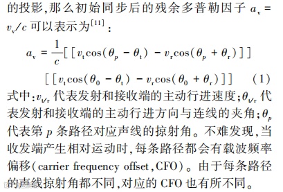 多普勒效应是由于发射和接收装置之间的相对运动引起的,由于声速相比于无线电磁波低了 5 个数量级,水声信道中由移动产生的多普勒频移不可忽略。对于单载波调制而言,发射和接收端的主动行进导致了较大的多普勒频移,如果默认同步算法补偿了与发射/ 接收端主动行进速度在参考路径上的投影,那么初始同步后的残余多普勒因子