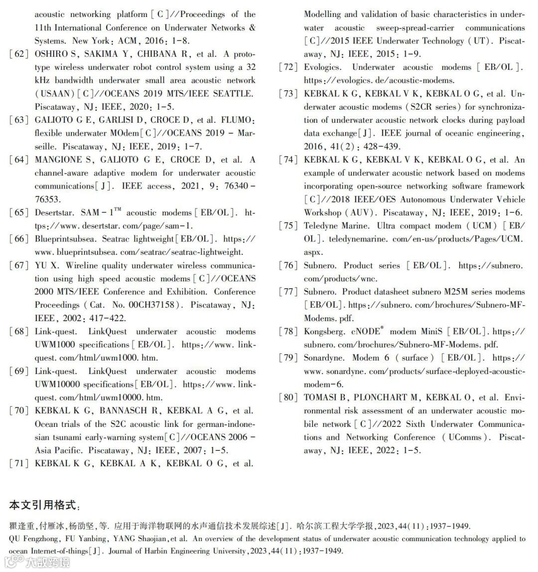 本文调研了近十年来国内外研究机构和公司最新的水声通信技术研究进展和搭建的水声通信机,发现绝大多数的水声通信机都符合小型化、低成本、可移动、易布放的特点,这极大程度地助力了海洋物联网的发展。