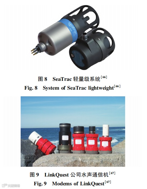 英国的 Blueprint subsea 公司生产的 SeaTrac 轻量级通信产品如图 8 所示,共包含 3 个型号,SeaTracX150、Sea-Trac X110、SeaTrac X010。SeaTrac X150 长度为 160 mm,机身 54 mm,保持架 59 mm。通信设备有主动多普勒补偿和通信定位一体化功能,空气中质量约为 720 g,工作深度可达 2 000 m,它使用 24 ~32 kHz 的扩频编码进行通信,通信最大距离可达1 km,符号速率为 100 baud,且具备多层声学协议栈。该产品待机功耗为 0. 6 W,工作时功耗约为 6 W。该系列中的最小型号 SeaTrac X010 产品总长度只有74 mm,机身 54 mm,在空气中只有 300 g,但其工作深度只有 300 m,且不具有定位功能[66]。