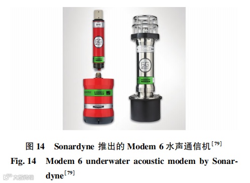 英国的 Sonardyne 公司推出 Modem 6 水声通信机如图 14 所示,Modem 6 水声通信机用于与水下传感器进行点对点的数据传输,是一款经济高效的水下通信设备,Modem 6 支持 0. 2 ~ 9 kbit / s 的数据传输速率,其中 Modem 6 Mini Dunker 是该公司最小的水声通信机,该型号水声通信机结构紧凑,易于安装,适用于从各种传感器传输和恢复数据,包括:流速剖面仪、温度深度传感器和各种定制仪器,可在恶劣的海洋环境中持续工作[79]。