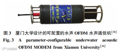 厦门大学在 2017 年研制的 AMLink 系列水声通信机采用扩频、高效纠错编码技术和抗多径信号的创新处理方案,具备测距、水下组网功能,传输速率在 20~400 bit / s 内可调,较高数据率传输时工作距 离 可 达 1 km, 较 低 数 据 率 时 可 以 传 输5~10 km[30]。2019 年,厦门大学团队设计了一款参数可配置的水声 OFDM 水声通信机,如图 3 所示,该水声通信机在长时延、大多普勒信道中实现实际数据传输速率和误码率的最优平衡。该小型化水声通信机的高度为 45 cm,内径高度为 10 cm,外径高度为 12. 5 cm,可通过电缆与主机交互的方式来配置接收机个数、确定空子载波数、导频子载波数和信道估计的方法。其最大接收功耗为 3 W,最大传输功耗为 40 W[31]。该团队还提出一种顺序自适应观测长度正交匹配追踪(sequential adaptive observationlength orthogonal matching pursuit, SAOLOMP ) 的方法来解决快速时变稀疏信道的水声通信问题[31],并提出了一种静态 -动态判别压缩感知( static-dynamic discriminative compressed sensing,SDD-CS)方法来探索浅海水声通信场景混合稀疏性[32],并用NS-3 网络仿真工具评估了稀疏信道下的水声传感器网络[34]。