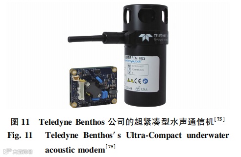 美国 Teledyne Benthos 公司推出的超紧凑型水声通信机( ultra compact modem,UCM) 如图 11 所示。该款通信机的 OEM 版本仅为 60×55 mm,质量仅有 55 g,休眠状态下的最大功率仅为 3. 5 mW,非常适合具有严格尺寸和质量限制的水下应用,例如微型 AUV 和小型海底仪器仪表。