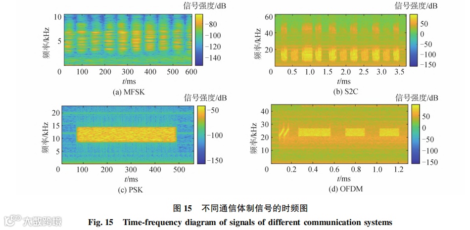 目前,从水声通信设备的通信体制来看,美国的Teledyne Benthos、英国的 Sonardyne、新加坡的 Subnero 等公司生产的主流水声通信设备大多采用较为稳健的 MFSK 和扩频的通信体制;德国的 Evologics公司持续采用 S2C 的扫频扩展载波技术,来解决信道多径问题;近年来美国的 Teledyne Benthos、Popoto、英国的 Sonardyne 等公司和国内浙江大学的基于PSK 的单载波水声通信机也在海洋物联网水下节点的市场占有一定的份额;同时,新加坡的 Subnero 等公司和国内的哈尔滨工程大学、厦门大学、中科院声学所等研究的 OFDM 水声通信设备通过更新迭代也逐渐成熟。以上 4 种通信体制信号的时频图见图15。随着水声通信调制解调技术的不断发展,未来的水下通信设备性能将有更大的提升空间。这将有助于海洋物联网水下节点的广泛部署,加快人类对海洋领域探索的步伐。