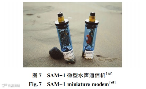 2011 年美国的 Desertstar 公司推出了一款如图7 所示的 SAM-1 微型水声通信机,该产品采用中等速率通信,典型的通信距离为 250 m,产品长度只有135 mm,直径只有 40 mm,最大工作深度为 300 m,最低功耗为 189 mW,通信速率可在 5 ~ 150 bit / s范围内调节[65]。
