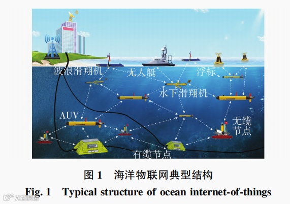 小型化、无缆化、智能化的海洋通信设备以及结 合多种通信方式的海洋物联网需要被广泛研究 。典 型的海洋物联网结构如图 1 所示 。除了少数有缆中 继外 ,海洋物联网主要包含定点和移动 2 种工作方 式 。其中 ,定点工作方式利用挂在浮标上的传感器 以及海底原位观测站装载的传感器进行工作 ;移动 工作方式利用水下滑翔机、水下自主航行器等携带 的传感器进行工作 。水下的固定节点和移动节点配 备水声通信装备 ,通过水声通信链路传输信息 。随 着人类对海洋的不断探索 ,这种小型化、低功耗的海 洋物联网系统更贴近实际海洋环境中的实时、原位、长时间立体观测的需求 ,在海洋经济、工程、科学以 及国防等领域发挥着不可替代的作用 。在海洋经济 和工程领域 ,海洋物联网可为海洋牧场和海洋环境 提供实时监测 ,为海底电缆光缆铺设、核电系统周围 海域提供实时的状态信息 。在海洋科学研究层面 , 海洋物联网具备海洋大数据获取、储存等功能 ,给予 科研人员足够的数据样本 。在国防事业中 ,海洋物 联网将作为“水下国门”为军事情报收集、信息监听 等多节点协同侦察提供保障。