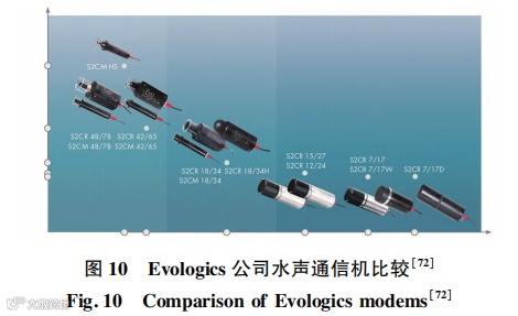 美国的 LinkQuest Inc. 在高速水声通信机的开发中结合先进的宽带扩频技术,显著提高数据率和鲁棒性[67]。该公司的产品面向全海域全场景,共推出了 UWM1000、 UWM2000、 UWM4000、 UWM10000等 8 款水声通信机来应对不同传输距离、不同速率的工作场景需求, 部分产品如图 9 所示。其中,UWM1000 超低功耗产品典型工作距离为 350 m,工作深度为 200 m,数据率为 9. 6 kbit / s,睡眠模式时功耗为 8 mW,接收模式下功耗 0. 75 W,宽带窄带传输模式下功耗 1 W,全向传输模式下功耗为 2 W。空气中质量为 4. 2 kg[68]。该公司的 UWM10000 型号产品的通信速率可达 5 kbit / s 定向工作距离可达10 km,但其空气中质量 21 kg,最大能耗 40 W,通信机的总长度为 580 mm[69]。