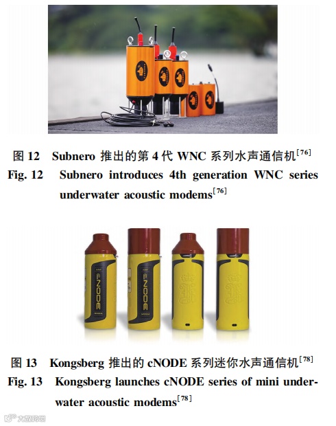 挪威 的 kongsberg maritime 公 司 推 出 cNODEMiniS 水声通信机见图 13,其具有 4 000 m 的最大额定工作深度,最大传输速率可达 6 kbit / s,最大发射功率有 100 W,休眠功率仅有不到 100 mW[78]。