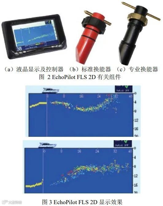 EchoPilot FLS 2D是Daniamant公司研发的前视声呐,该产品最大特点是小巧便捷以及其独特的换能器结构设计,是专门为海上救援而设计的。图2为EchoPilot FLS 2D成像系统的组成部件,该设备配备了7英寸(对角线)TFT LCD全彩显示器,当回声较强时其显示色彩不同,给人以更佳的视觉效果,而且能够获得更多关于海底的自然信息,显示效果如图3所示。用户可根据实际应用,选择专业传感器或标准传感器。2D前视声呐显示更新时间0.5s,最大前向探测距离200m,最大探测深度100m。