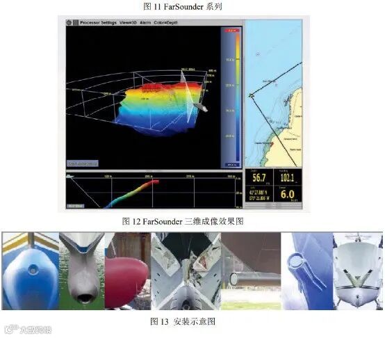 美国Farsounder公司研发的FarSounder-500和FarSounder-1000产品,如图11所示。其中FarSounder-500水平探测角度范围90°,最大探测距离500m,其三维成像效果如图12所示。FarSounder-1000探测角度范围有两种模式,分别为90°和60°。在探测范围为60°时,其探测距离可达1000m。此外该系列前视声呐拥有自动检测底部、测量最小深度、多种显示模式(包括日间模式、黄昏模式、夜间模式和红色模式)以及导航信息显示功能等,设备安装效果如图13所示。