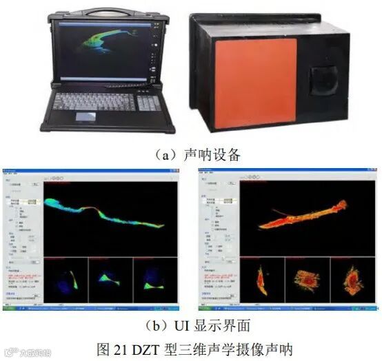 第七一五研究所和浙江大学共同研制的DZT型三维声学摄像声呐(图21),工作频率300kHz,能够对200m以内、50°×50°开角范围的目标实时成像,距离分辨率2cm,显示帧率最大10Hz,具有运动目标实时检测、动态分类和三维目标识别等功能。
