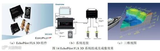Daniamant公司研发的EchoPilot FLS 3D是一款三维前视声呐产品,如图14(a)所示,该设备可以对船只前方水下场景进行三维显示,海底的地形和潜在的危险可以真实性表示出来,显示效果是一个实时的声呐图像,而不是渲染成的3D效果,如图14(c)所示。无论外壳形状如何,两个具有伸缩结构的换能器都能确保完全覆盖前向,前向探测角度范围60°,垂直探测范围90°,向前探测距离可达200m,探测水深100m。