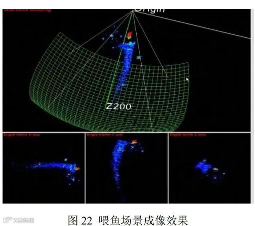 图22为用DZT型三维成像做喂鱼成像效果的测试。图中成像的场景为:三维图像声呐入水深度50cm,并保持静止不动,其下方3m处用绳索固定着一条长约50cm的鱼,将一团粉末状饵料投入水中,诱饵球逐渐下沉。