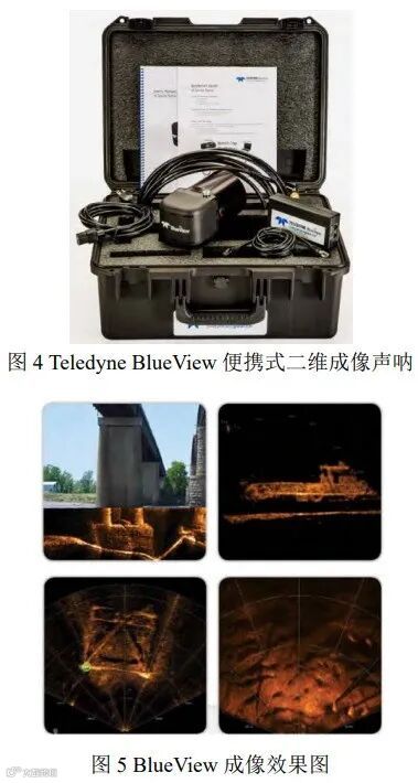图4为Blue View的便携式二维成像声呐,工44作频率900kHz,视角范围达130°,最大探测距离100m,距离分辨率1.3cm。所有的M900系列声呐,无论是移动探测或固定地点安装,均能实时传输图像和数据,视频输出帧率最快27Hz,可应用于ROV实时导航、目标探测/识别、目标跟踪、避障、操作监控、区域/结构物检查等场合,其成像效果如图5所示。