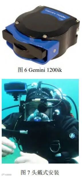 图6为Gemini 1200ik多波束成像声呐,工作深度350m,它提供了一种紧凑型实时高频成像的解决方案,这使得它可被安装到中小型船只,也可安装在浅水作业的大型船只上。独特的设计使它可以非常容易地安装到不同的水下潜器和平台上。该声呐工作频率为1200kHz,优化的信号处理电路设计使声呐能够提供极其清晰的实时图像。该设备集成了一个声速计,能够帮助声呐头进行图像锐化和精确测距。120°的水平覆盖范围为使用者提供一个印象深刻的视野范围。采用的chirp处理技术,确保Tritech Gemini 1200ik多波束图像声呐能够提供更远距离的高分辨率成像,而集成的VOS(Vectory of Sound)传感器确保了图像的高精确度显示。此外该成像声呐还可以装配于潜水员头盔面罩上方,通过水下视频眼镜呈现水下环境情况,如图7所示。