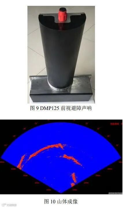 中国船舶第七一五研究所研制的一款二维前视避障声呐(DMP125),如图9所示,工作频率125kHz,探测距离可达500m,可探测120°×20°视角范围内的移动目标和静止目标,距离分辨率达到10cm,方位分辨率小于1°,可实现碰撞危险自动分级报警。通过充油设计,使得设备可工作于1200m水深。该设备对山体的成像效果如图10所示。