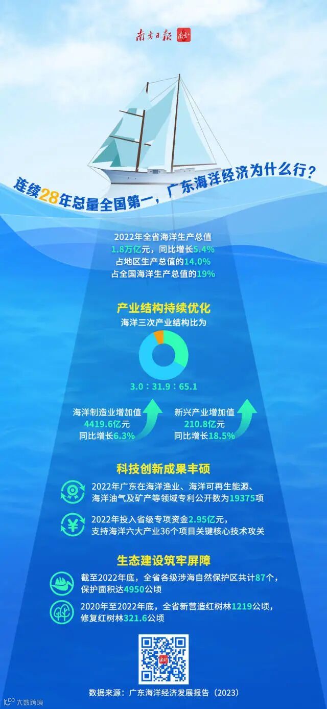 数据显示,全省海洋生产总值从2012年的1.05万亿元增长到2022年的1.8万亿元,连续28年位居全国首位。