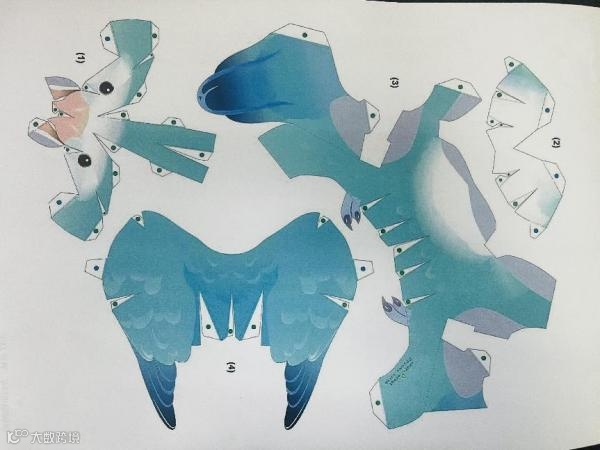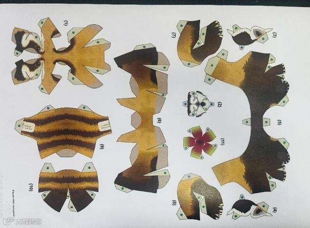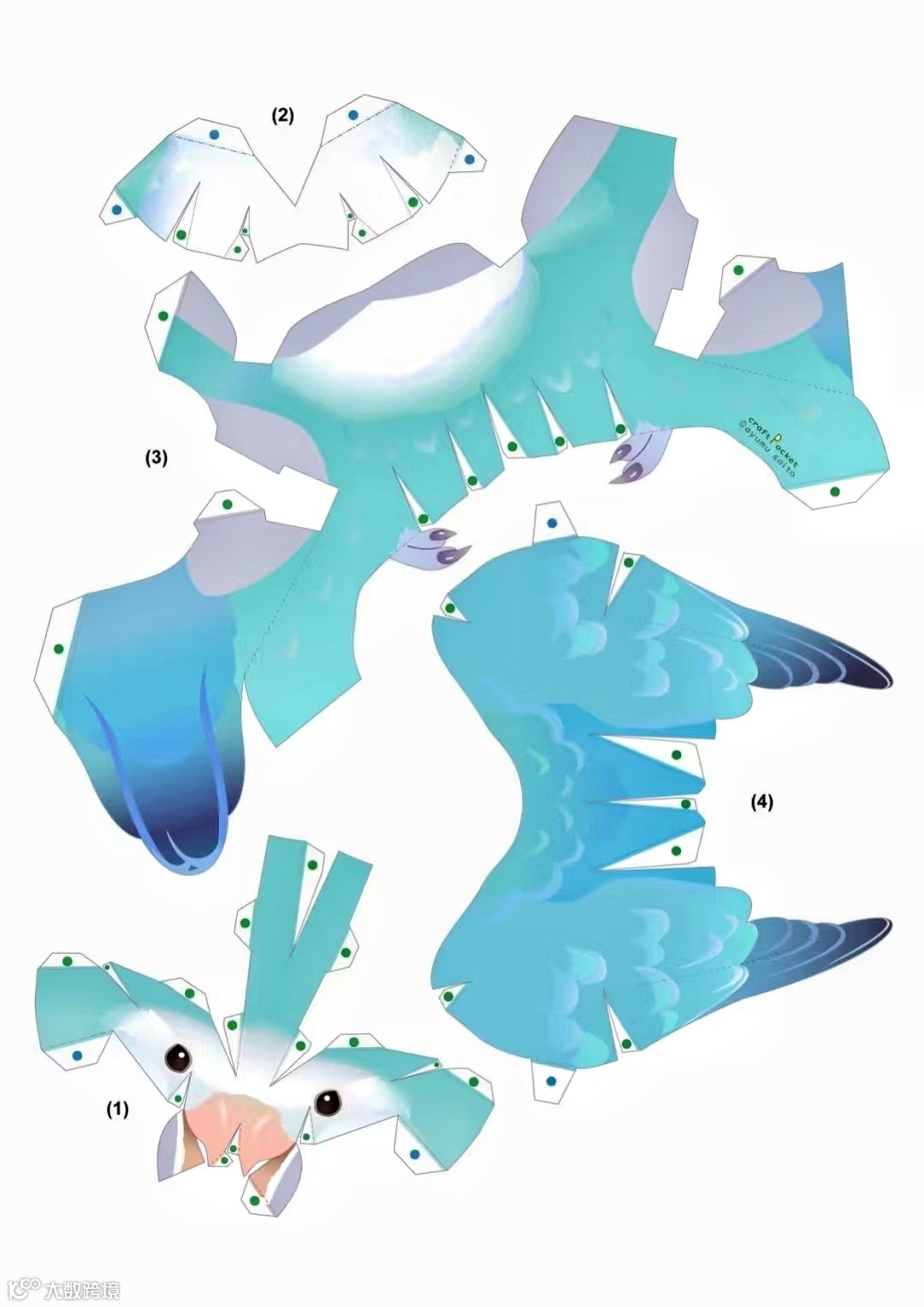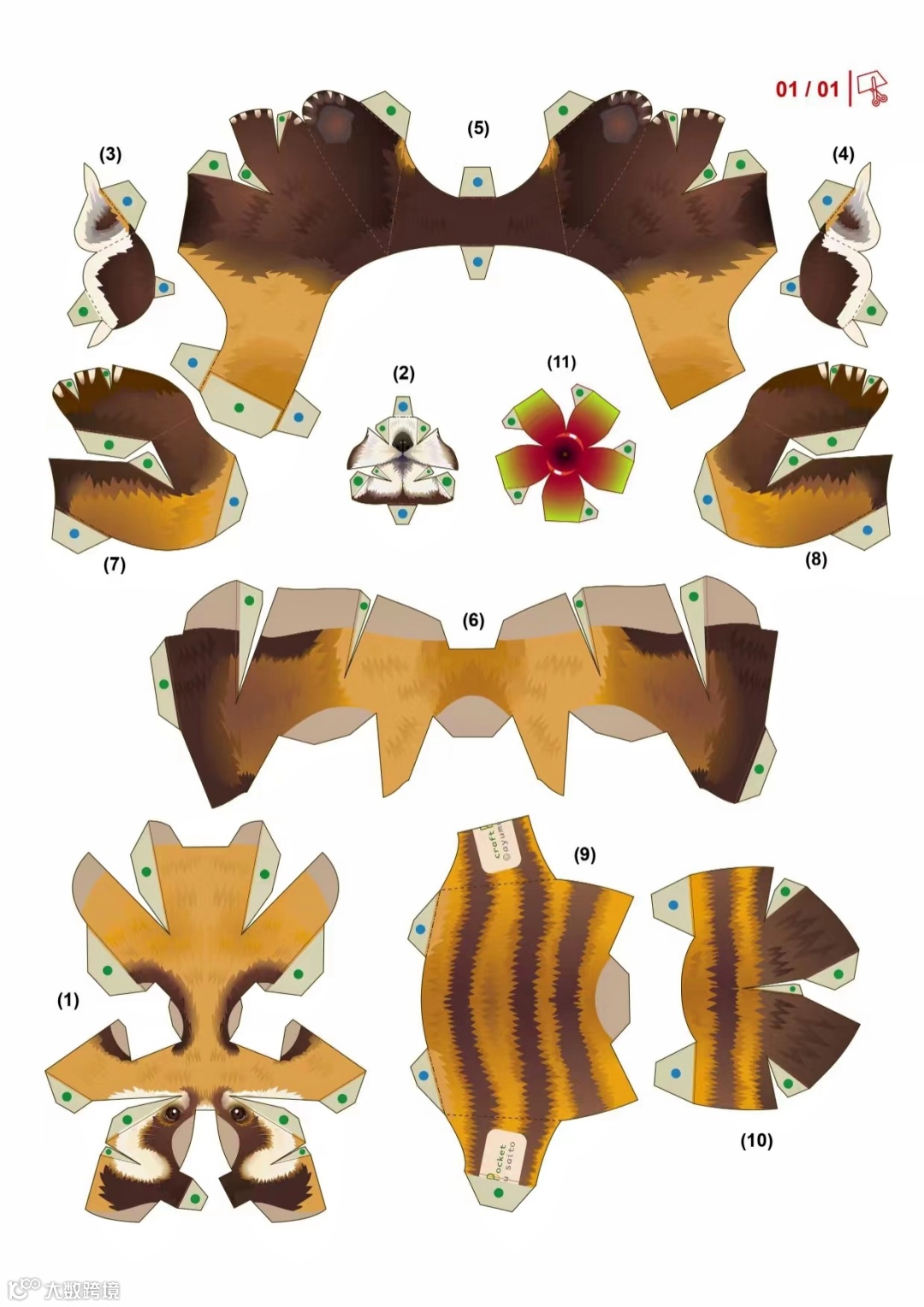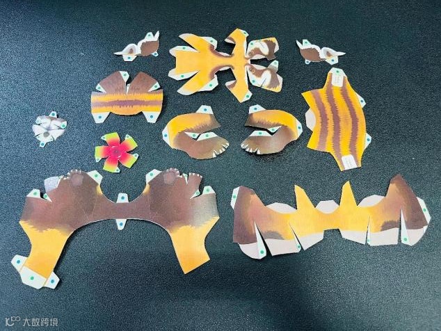 将图样上带有绿色圆点标记的区域,用固体胶粘贴起来,组成萌宠各个部位的小零件。