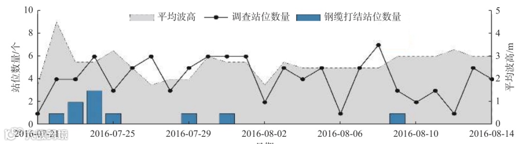 统计分析2016年7月21日至8月14日每日的调查站位、钢缆打结站位数量,以及平均波高(图11)可见:整个大面站调查期间,每日的调查站位数量为1~7个;平均波高为1.75~4.50m;在这种作业海况的背景下,前5日内共在7个调查站位发生了钢缆打结现象,占整个钢缆打结站位的70%;而采用我们的改进解决方案后,在其后20天的调查时间内,仅在第9天、第11天、第20天各发生1次钢缆打结现象。