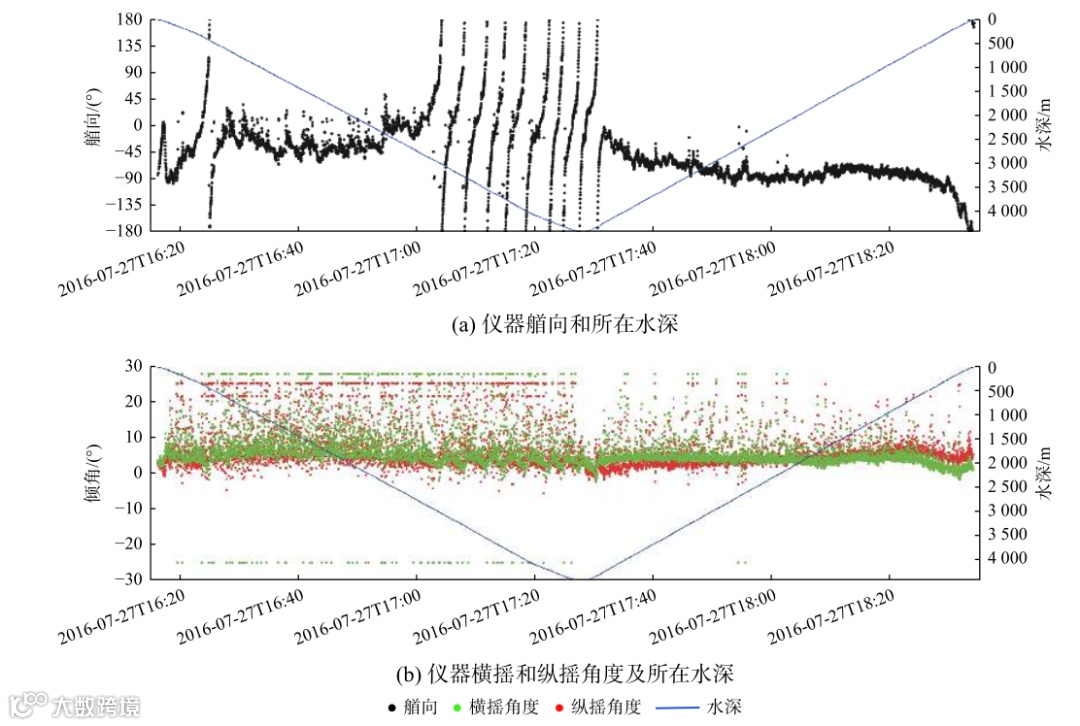 下放式观测过程中,仪器受波浪、海流、浮力、下放速度和船只摇晃等因素的影响,使其姿态并非稳定不变,而是存在着各种方向的姿态变化。LADCP与CTD框架固定在一起,因此LADCP的姿态也就代表了整个观测单元的姿态。由于LADCP本身带有姿态传感器,为了解CTD/LADCP捆绑式观测水下单元在观测过程中的姿态,可以利用其反演出的仪器纵摇(Pitch)、横摇(Roll)、艏向(Heading)等姿态数据分析观测单元的姿态。艏向为角度值,反映仪器艏向的变化,利用艏向数据可以判断CTD观测架在水下是否发生旋转现象。