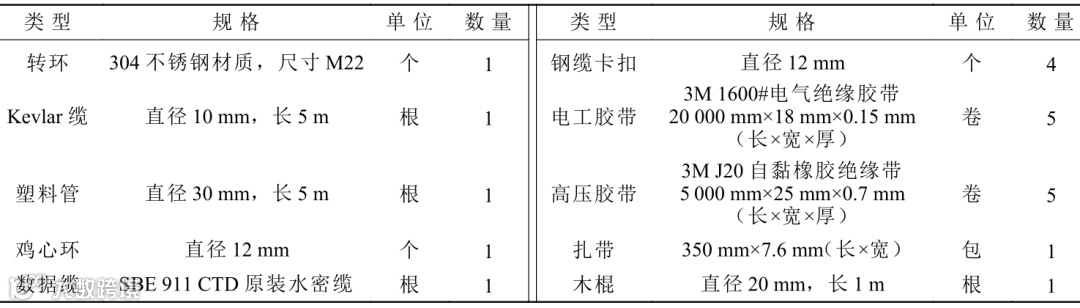 通过以上分析可知:同轴铠装缆受到的扭力若得不到释放,就很容易发生打结现象;而使同轴铠装缆发生打结现象的扭力来自于CTD框架自身的旋转。为了能在恶劣海况下继续开展大面调查,在保证全要素观测的前提下,我们现场研究得出的解决方案为:在同轴铠装缆与仪器框架之间加装转环,同时数据缆留有余量。当仪器框架转动时,多余的数据缆会缠绕在转环附近,这样就释放了仪器框架旋转产生的扭力,防止了同轴铠装缆“打结”,消除了自缠绕隐患,从而保证了仪器的安全和数据的传输。为此,在对CTD观测架改装之前,我们准备了转环、Kevlar缆、塑料管、鸡心环、钢缆卡扣、电工胶带、高压胶带、扎带、木棍等主要材料,如表1所示。