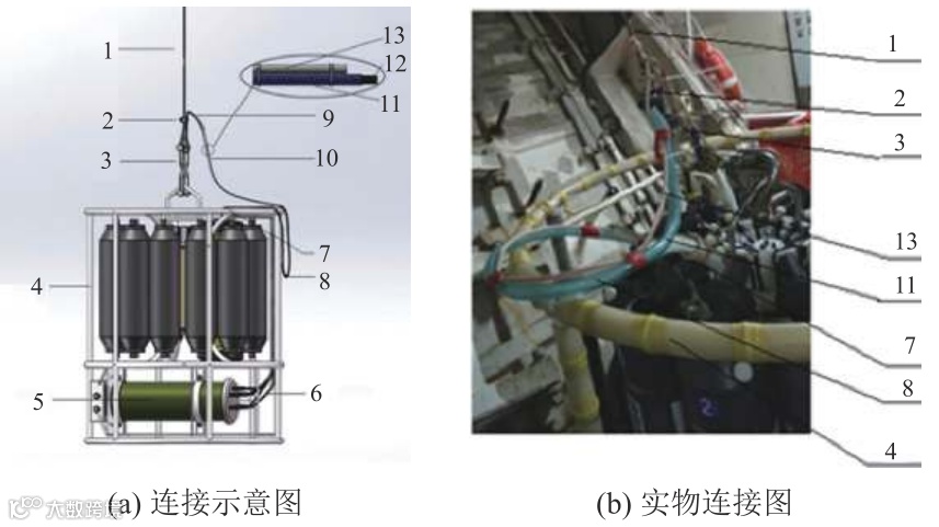 注:1为同轴铠装缆;2为钢缆卡扣;3为转环;4为框架;5为CTD主机;6为CTD主机连接端;7为数据缆固定点;8为缠绕/富余的数据缆;9为同轴铠装缆-外层钢缆;10为同轴铠装缆-同轴线;11为套管;12为数据缆(与8为同一根数据缆);13为Kevlar缆。
