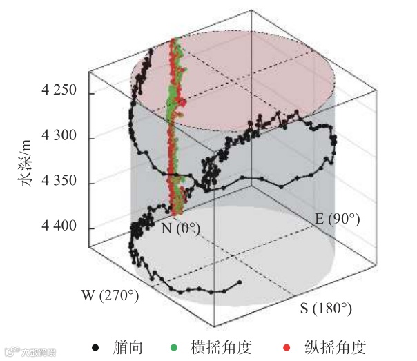 为了更直观地展示水下单元随水深的旋转情况,将图4中对应的数据进行三维化处理,在角度值和水深值之外,另增加一固定值R为第三维,使得艏向、横摇角度、纵摇角度和水深值在半径为R的圆柱体表面变化,继而得到艏向、横摇、纵摇随水深变化的三维图(图5)。图中垂直坐标为仪器所在深度,水平坐标代表E−W、S−N方位。结合图4和图5可见:在不到3min的时间,艏向便完成了一周的旋转。