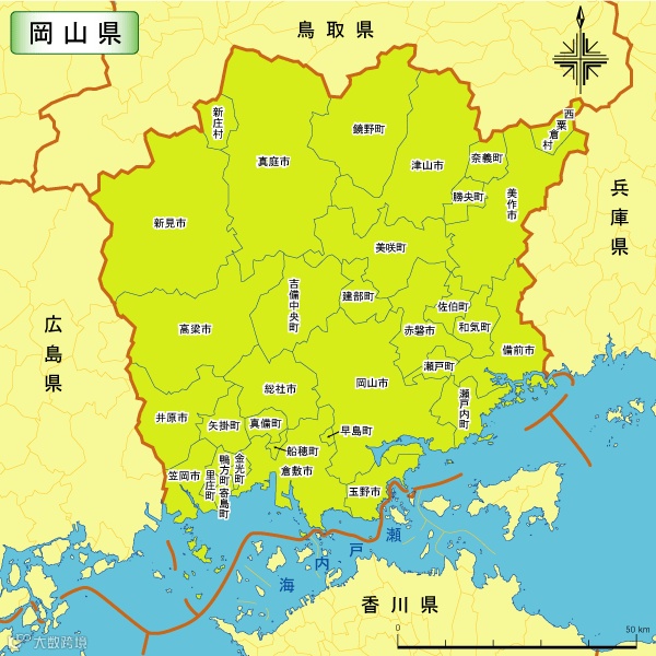 冈山县海洋牧场位于冈山县西部笠冈市的白石岛和高岛中间的海域,总面积约350hm²。项目总投资约21亿日元。冈山县海洋牧场建设通过改善现有渔场环境、投放人工鱼礁、建造海藻床等方式,扩大目标鱼类的栖息场所,同时利用音响投饵设备,使目标鱼类明显增加。另外,由于加强了自然环境的管理,这个海域不仅成为该地优良的渔场,而且成为日本水产资源的供给基地。