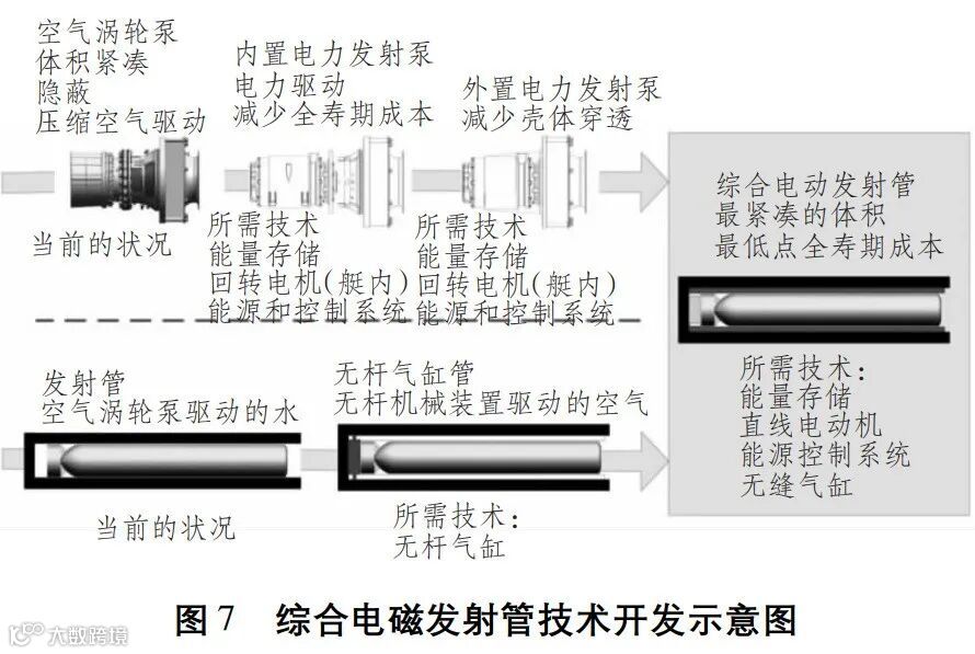 在电磁发射泵开发的同时,还需要开发无轴气缸以替代压缩空气源,并与发射管集成。综合电动发射管必需的能源和控制系统布局技术也将得到论证,确保其能够适应潜艇作战环境的要求。综合电动发射管将成为真正的外置发射管,并和潜艇的“任务模块”概念结合,让潜艇能够根据任务需求选择负载合适的发射能力。