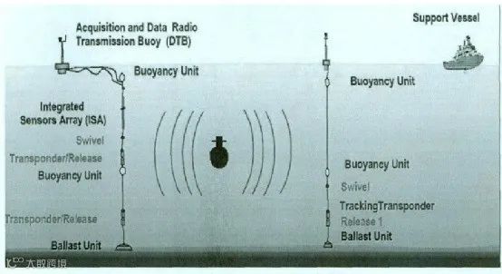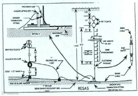 位于巴哈马的实验区深度1830m,底部布放水听器和跟踪阵,表面有雷达表面测距系统。