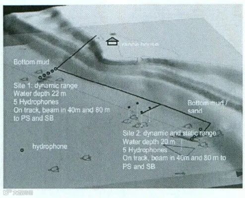 德国在Ashao建立了浅水固定试验场用于测量过往船只的水下辐射噪声。Aschau浅水试验场属于德国Bundeswehr舰船和海军武器技术中心,位于波罗的海Eckemfoede角,水深20m,水听器距离水底l-2m。适用于海军舰艇和商船水下辐射噪声测试。