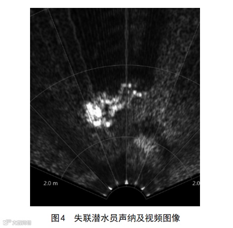 事发水域为水库,没有风浪。当发现疑似目标点后,水下机器人搭载定位和声纳探测传感器在疑似目标区域下水,通过声纳对该区域进行扫描,获得疑似目标物的相对位置后,操作水下潜器不断靠近疑似目标,直至水下潜器的摄像头观察到失联潜水员。失联潜水员声纳及视频图像如图4所示。