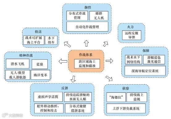 有效遂行上述对抗任务,涉及6方面能力:①侦察预警能力,能够综合运用各种固定和机动侦察预警手段,发现、跟踪、识别和报知水下威胁目标,及时准确地提供水下目标情报信息;②指挥控制能力,建成多手段并用、节点联接紧密、信息传输快捷、辅助决策高效、覆盖范围广泛的指挥网络与控制系统;③隐蔽突防和打击能力,通过提高水下平台的综合隐身性能,使先进水下兵器能够对敌方的航母编队、港口基地等重要目标构成有效威胁;④水下防御作战能力,运用多种反潜、反水雷、反水下特种作战手段及时可靠地消除水下威胁;⑤水下信息作战能力,对敌方的潜艇和水中兵器实施信息对抗,干扰、欺骗、压制、摧毁敌方的水下警戒系统和水下网络信息系统;⑥综合保障能力,实现对全球重要海域的全时环境测量监测,导航定位精度和水下目标特性数据满足水下长时间航行和武器使用要求,具备深远海援潜救生能力。