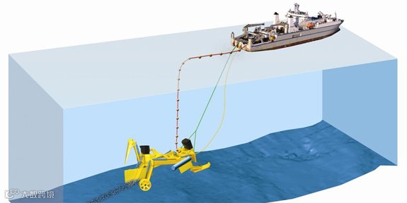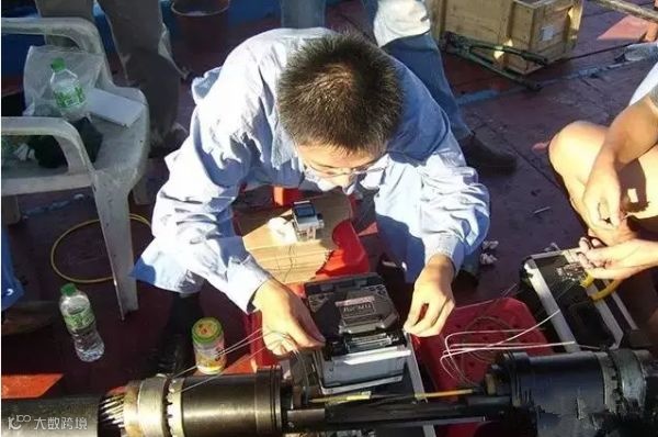 其次,由机器人将埋在海底的光缆挖出,然后将其切断,分别将剪断的两端系上船上放下的绳子,拉出海面。