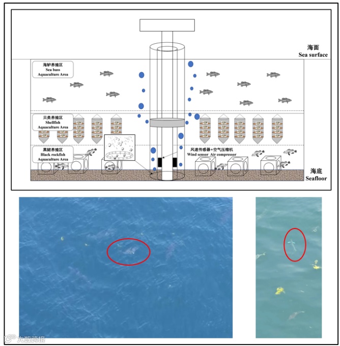 图5 未来“海上风电场与海水养殖一体化”展望图(上),海上风电场附近的鱼群影像(下)