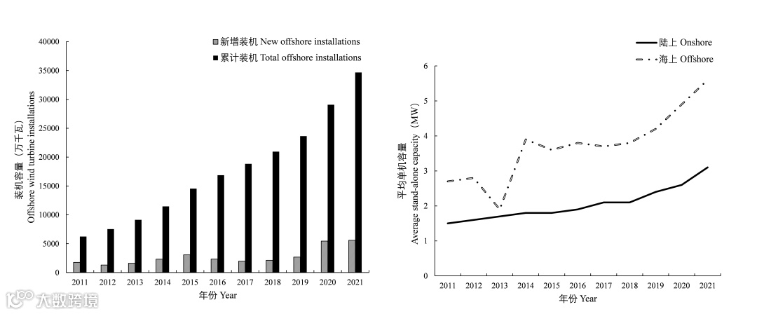 图2 2011-2021年我国海上风电新增和累计装机容量及(左)平均单机容量(右)(数据来自GWEC)