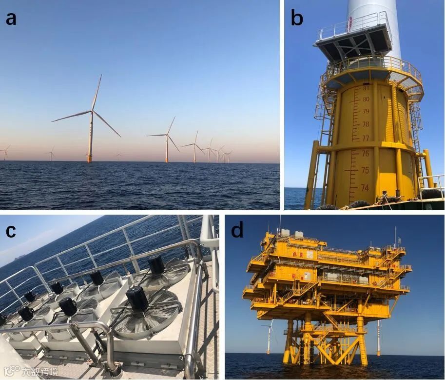 a: 海上风机,b: 单桩基础,c: 水冷散热风扇,d: 升压站